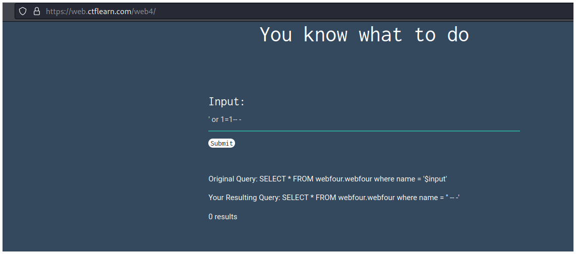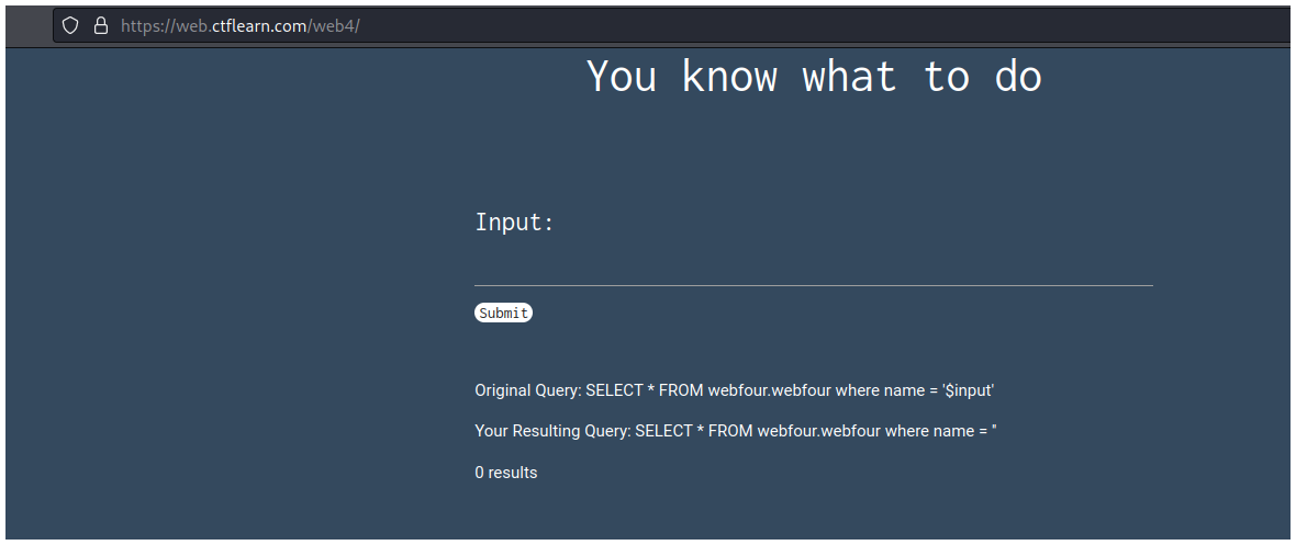 En la página podemos ver un campo de input donde debemos escribir una SQLi para obtener la flag.