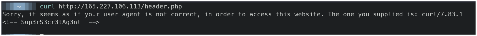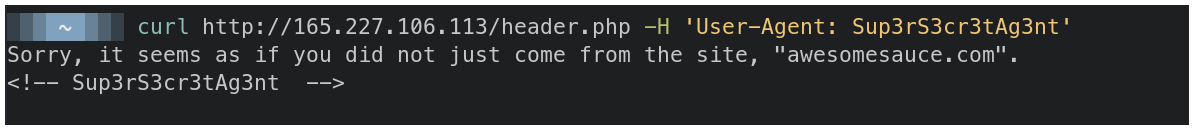 $ curl http://165.227.106.113/header.php -H 'User-Agent: Sup3rS3cr3tAg3nt'