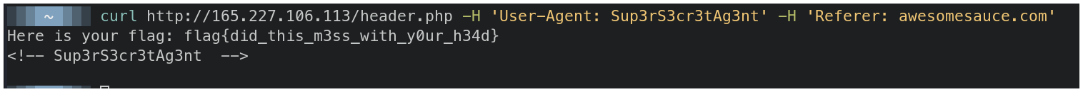$ curl http://165.227.106.113/header.php -H 'User-Agent: Sup3rS3cr3tAg3nt' -H 'Referer: awesomesauce.com'