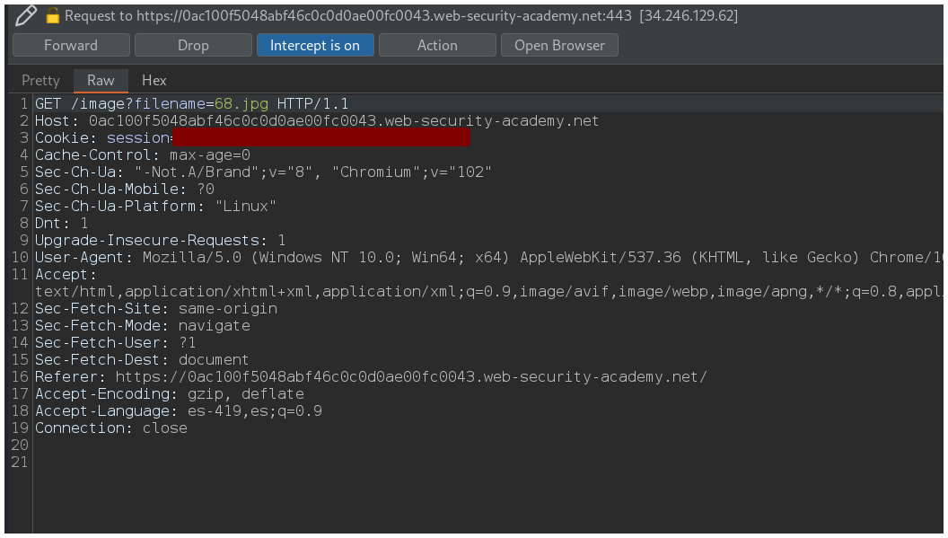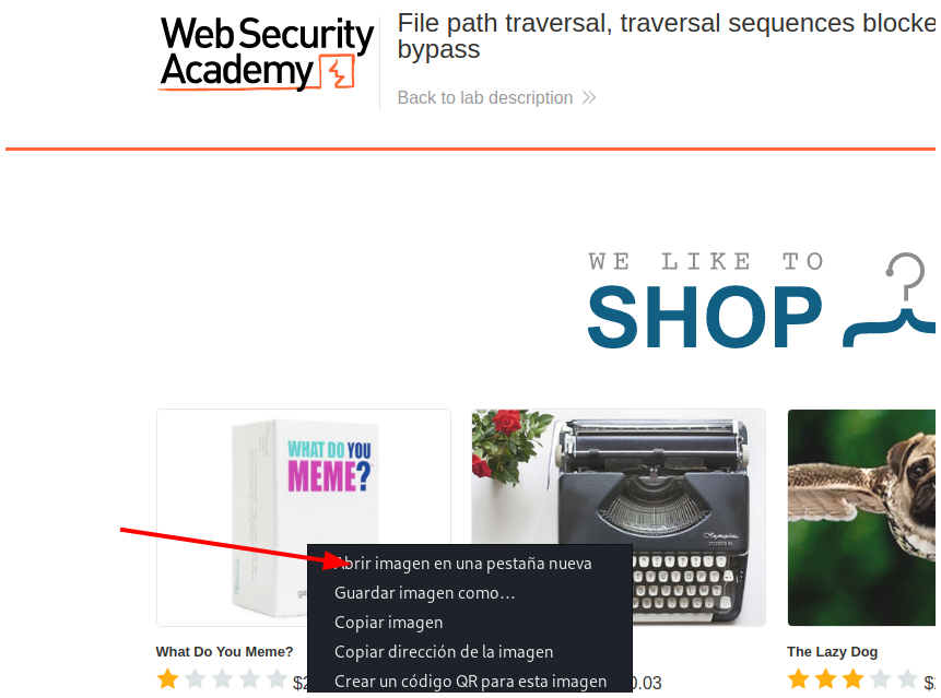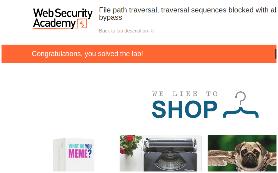 PortSwigger - File path traversal, traversal sequences blocked with absolute path bypass.