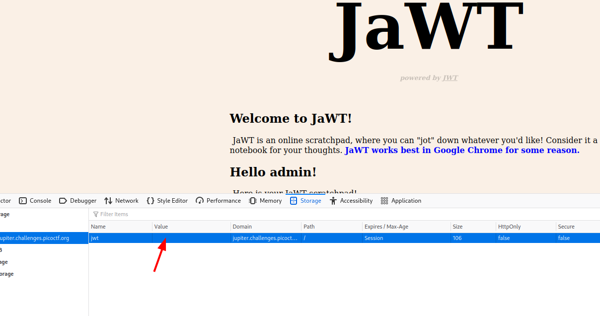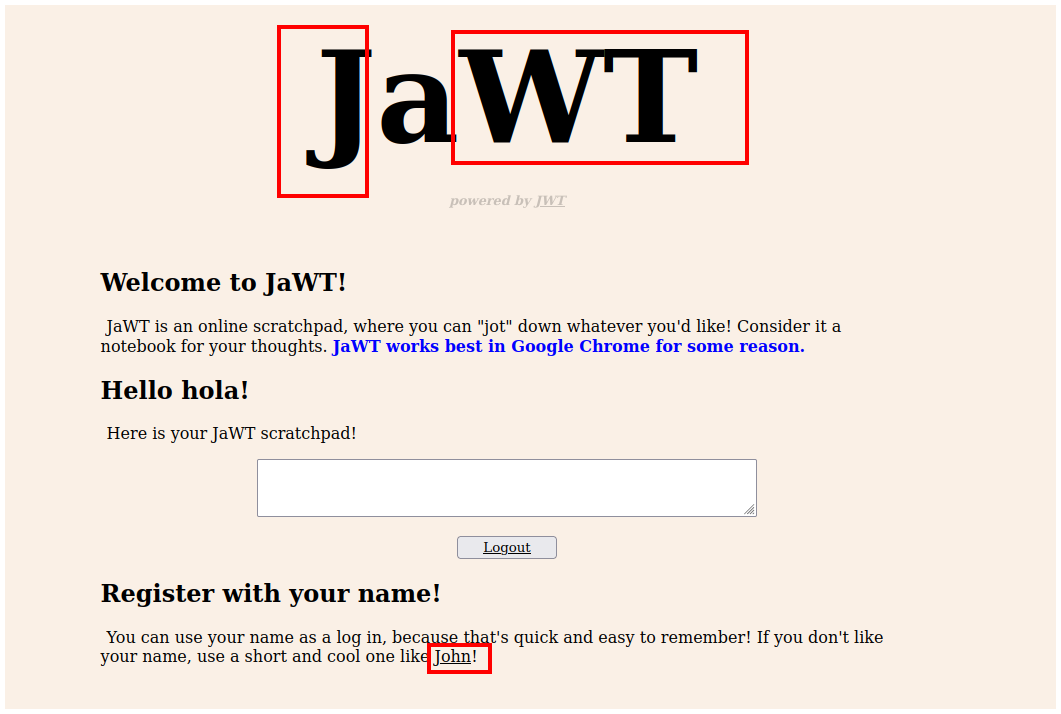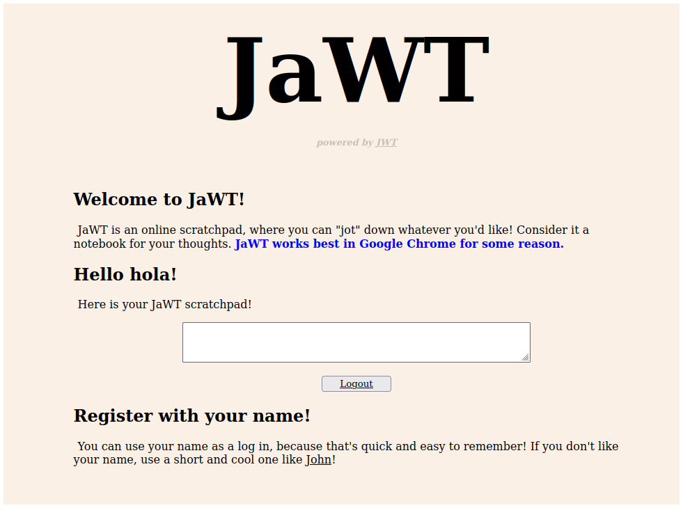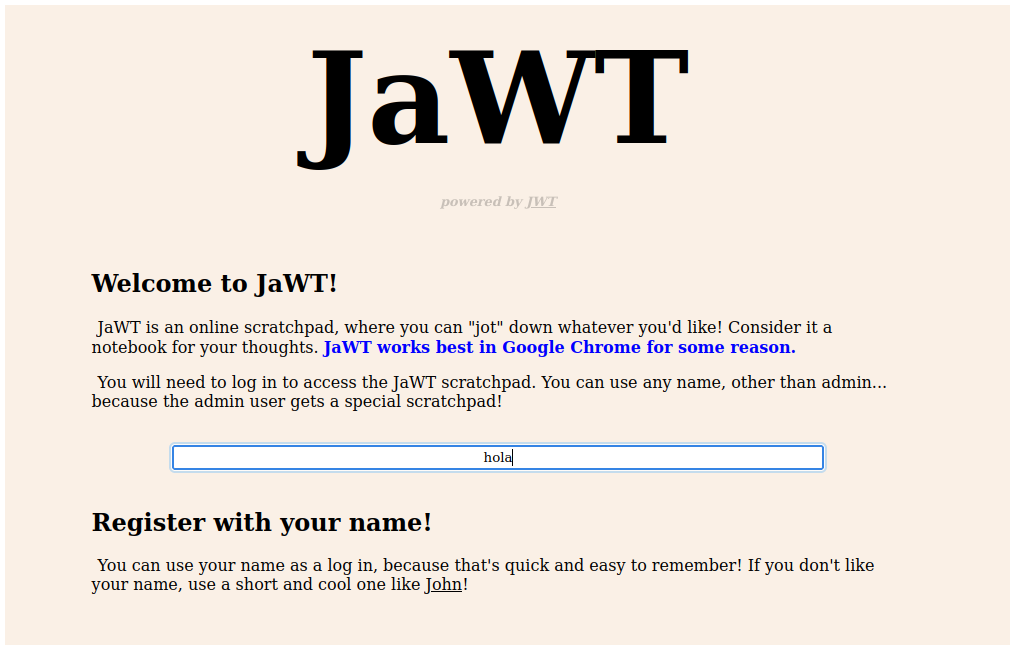 Primero, el nombre de la aplicación es JaWT, si juntamos las letras mayúsculas nos queda JWT que son las siglas de Json Web Token. Romper un JWT es muy común en CTFs.