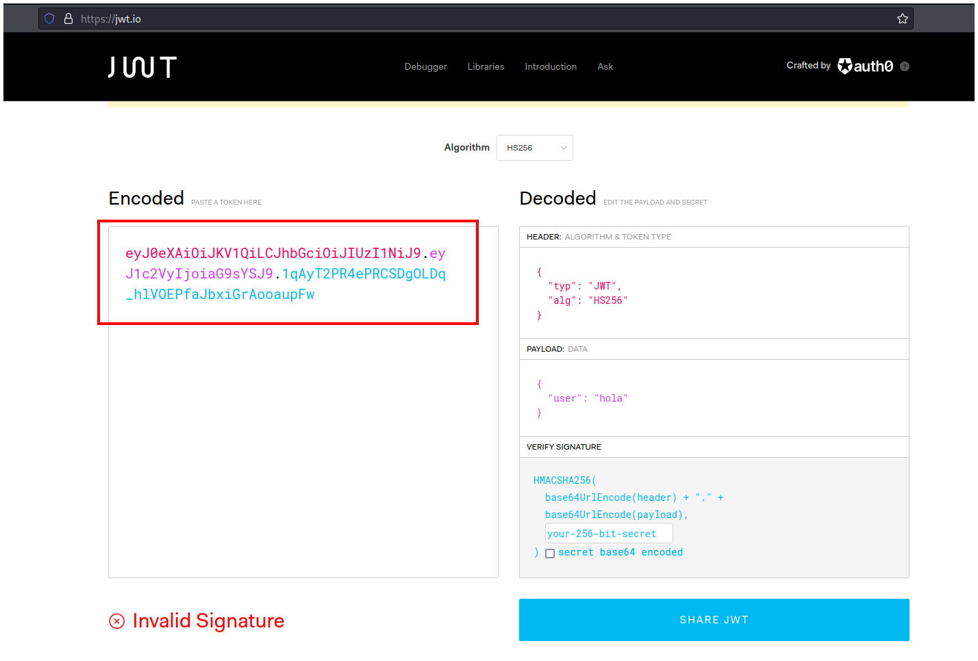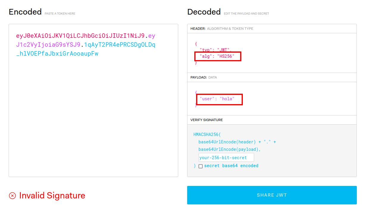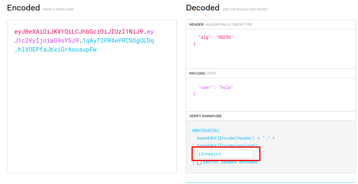 Colocamos este secreto en la pestaña VERIFY SIGNATURE.