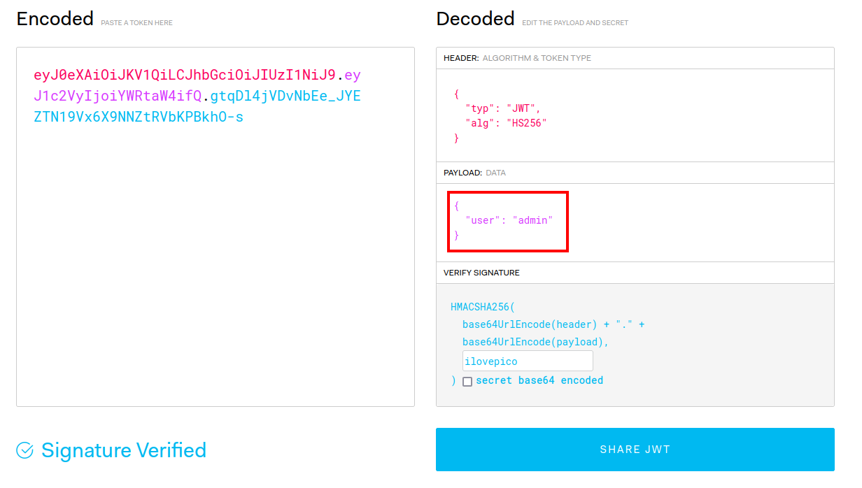Podemos ver 2 cosas importantes, el algoritmo y el usuario. Con el algoritmo podemos decirle a john el formato que debe usar para realizar su ataque, y si encontramos el secreto podremos cambiar el nombre de usuario a admin.