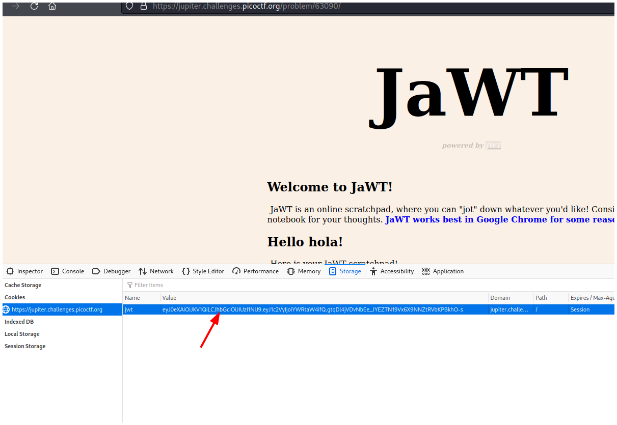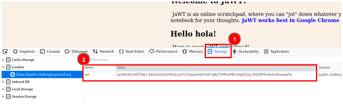 Si inspeccionamos la página y vamos a la pestaña Storage, veremos el valor del jwt.