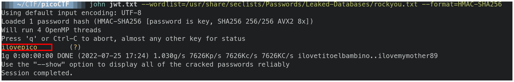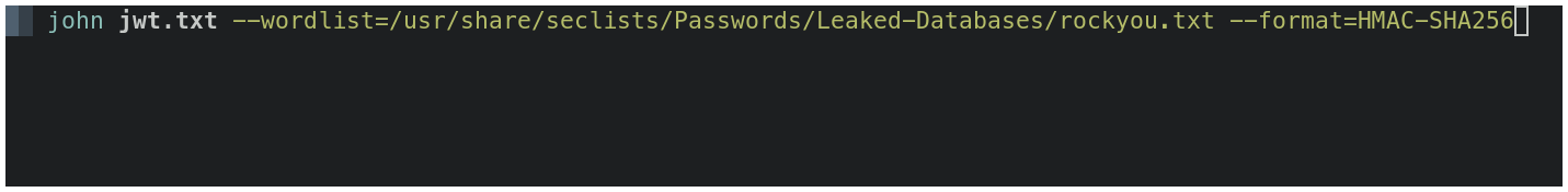 $ john jwt.txt --wordlist="el_diccionario_que_utilizarás" --format=HMAC-SHA256