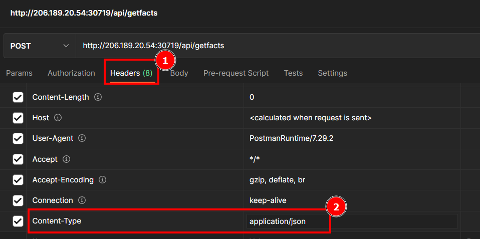 Luego vamos a la pestaña Headers y agregamos una nueva cabecera Content-Type: application/json.