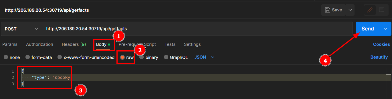 Vamos a la pestaña Body, seleccionamos raw, ingresamos nuestro json con el valor spooky para comprobar que estamos realizando la petición correctamente y presionamos el botón Send.