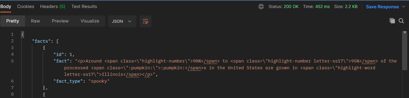 Leyendo el códido fuente vemos que la página renderiza los Spooky Facts a través de una petición JSON, donde debemos indicar el tipo de Fact que queremos ver.