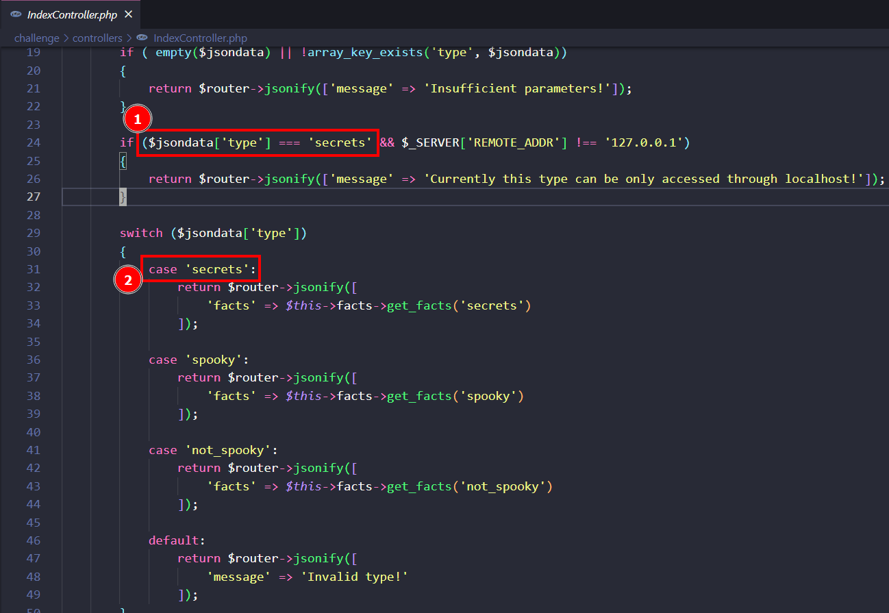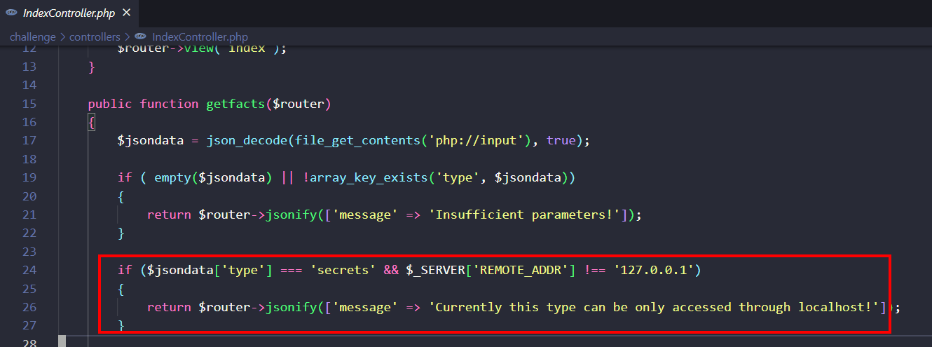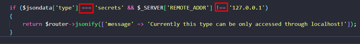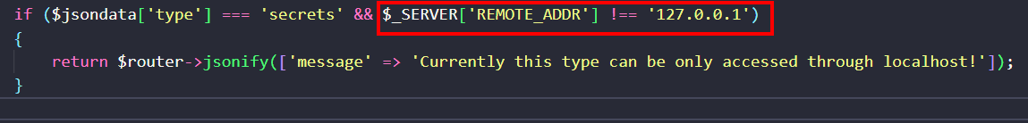 Como vimos anteriormente en la base de datos, la flag tiene valor secret, así que debemos enviar un JSON con la key type y el valor secrets. Pero ocurre un problema, si indicamos el valor como secrets la aplicación realiza una comparación: nuestra ip debe ser 127.0.0.1.