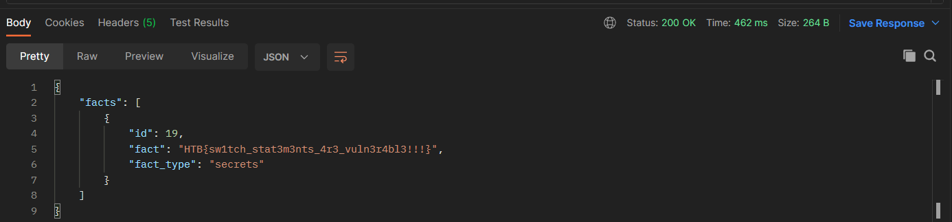 Analizando el código un busca de comparaciones que sean vulnerables no encontraba nada, así que simplemente cambié el valor en el JSON de "secrets" a true, a ver si pasaba algo.