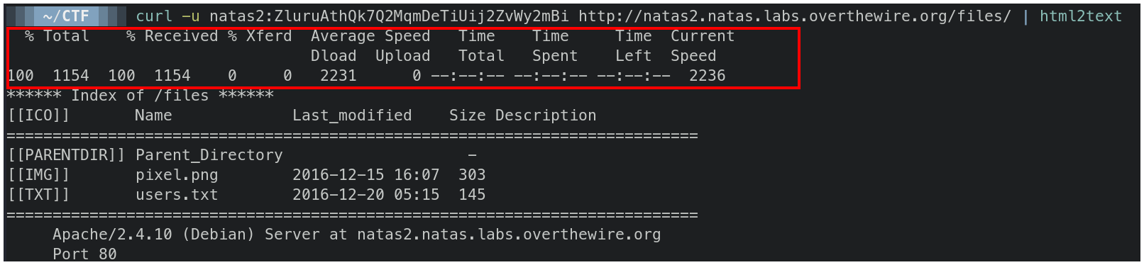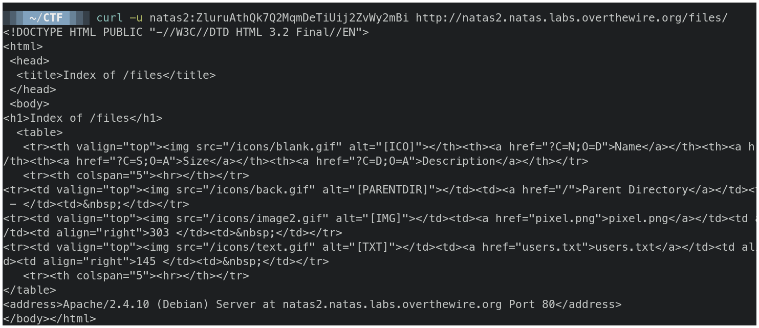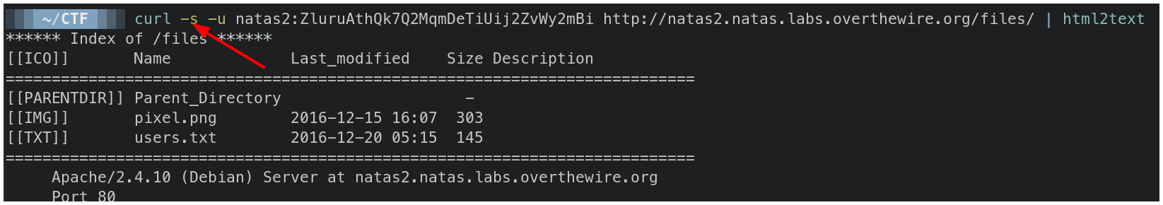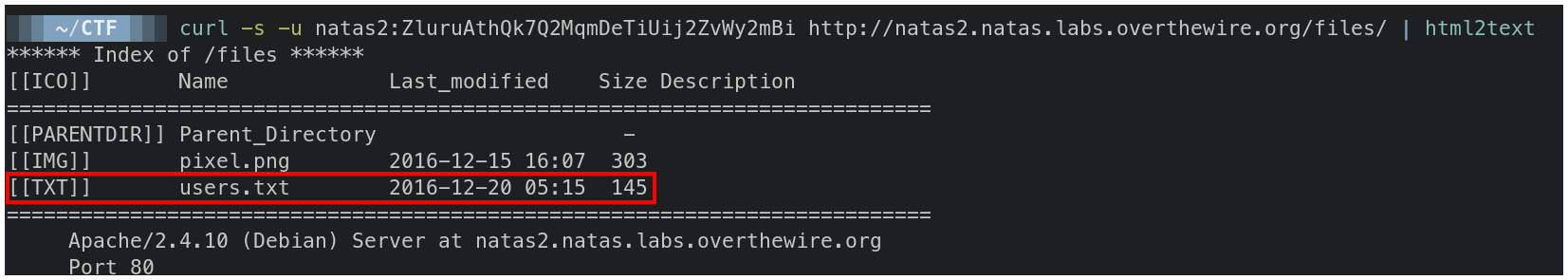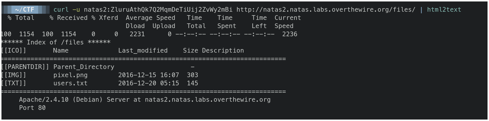 curl -u natas2:ZluruAthQk7Q2MqmDeTiUij2ZvWy2mBi http://natas2.natas.labs.overthewire.org/files/ | html2text