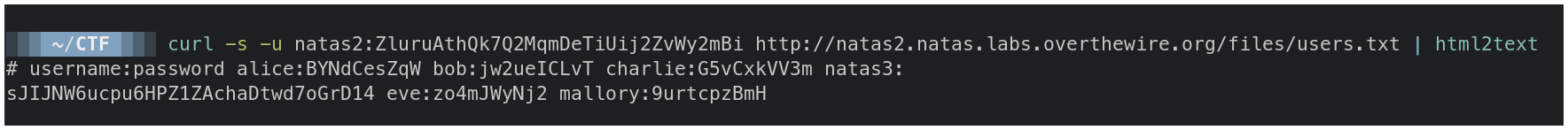 curl -s -u natas2:ZluruAthQk7Q2MqmDeTiUij2ZvWy2mBi http://natas2.natas.labs.overthewire.org/files/users.txt | html2text