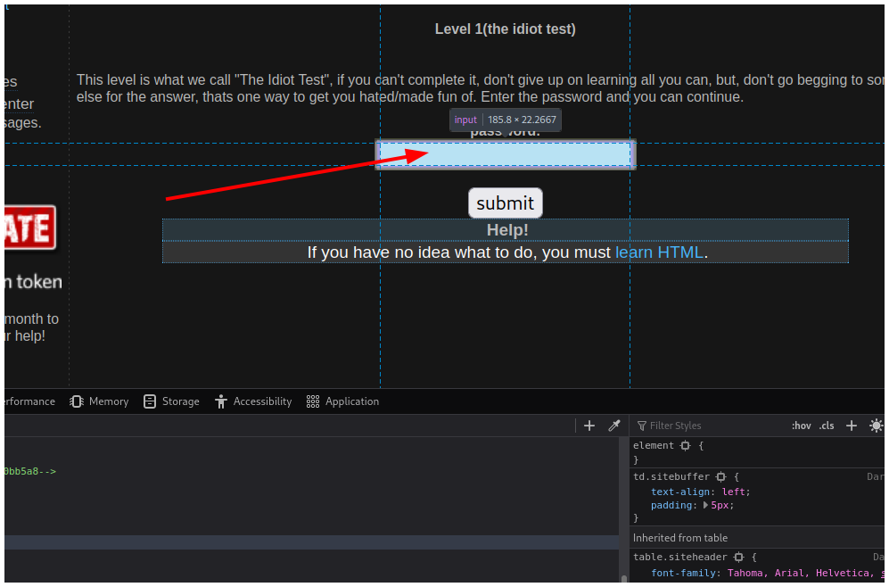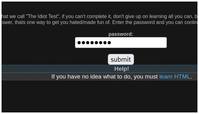 This level is what we call “The Idiot Test”, if you can’t complete it, don’t give up on learning all you can, but, don’t go begging to someone else for the answer, thats one way to get you hated/made fun of. Enter the password and you can continue.