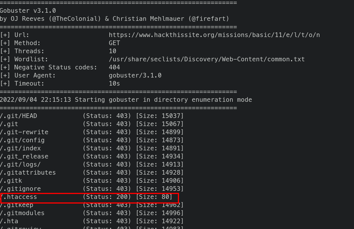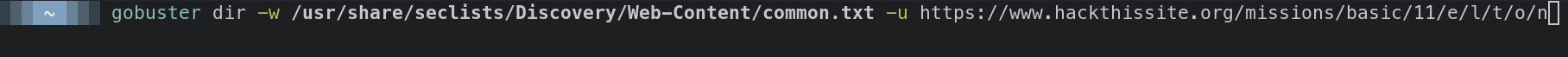 gobuster dir -w /usr/share/seclists/Discovery/Web-Content/common.txt -u https://www.hackthissite.org/missions/basic/11/e/l/t/o/n