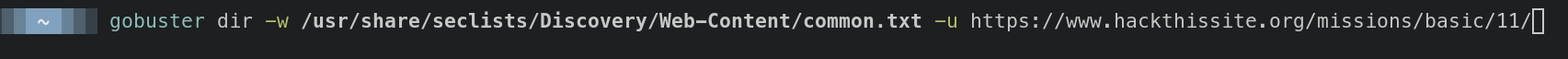 gobuster dir -w /usr/share/seclists/Discovery/Web-Content/common.txt -u https://www.hackthissite.org/missions/basic/11/