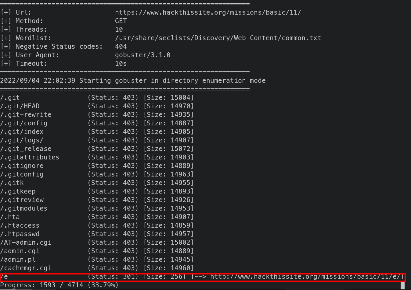 Vemos un código 301 Redirect con el nombre e, esto significa que la ruta http://www.hackthissite.org/missions/basic/11/e/ es una ruta vália. Podemos ignorar los que tienen código 403 Forbidden ya que no nos sirven.