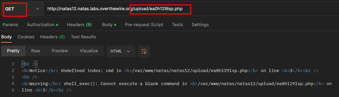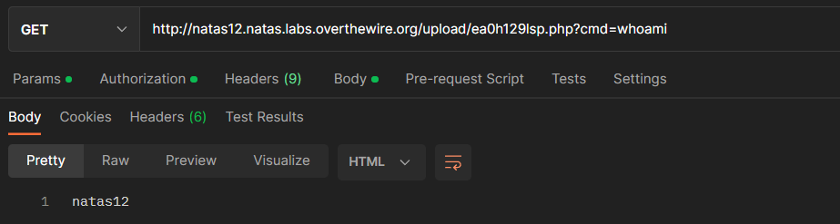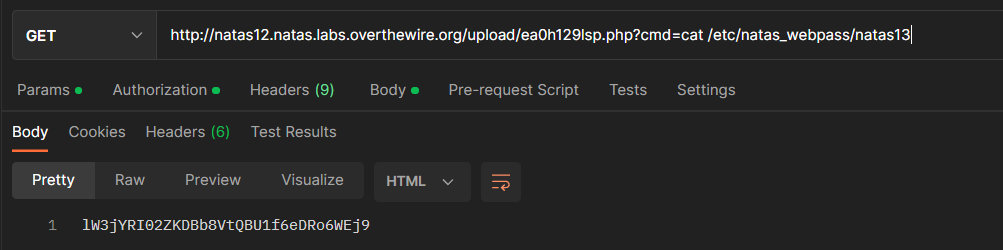 Ejecutamos el comando cat /etc/natas_webpass/natas13 veremos la contraseña en la respuesta.