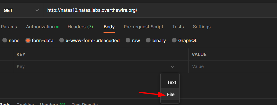 Para poder enviar una imágen desde Postman debemos ir a la pestaña Body y seleccionar form-data.