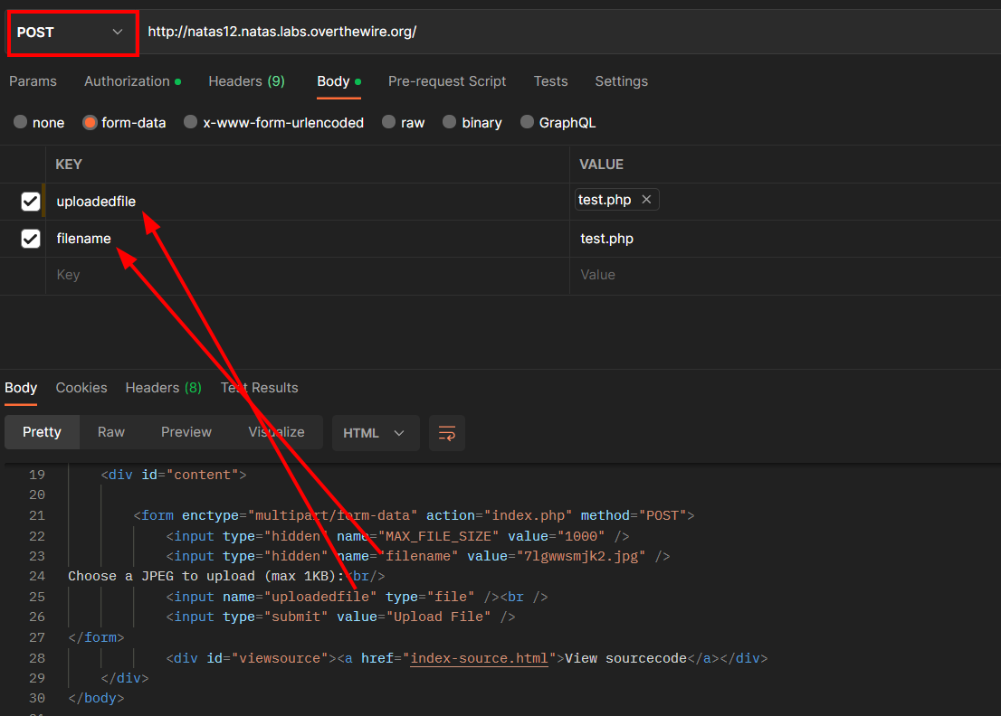 Cambiamos el método a POST, le agregamos el nombre al campo donde subiremos la imagen uploadedfile y también agregamos un campo llamado filename a cualquier nombre. Lo importante del campo filename es que la extensión debe ser .php para que el servidor lo interprete como php, ya que si observamos el código fuente no encontraremos ningún filtro que nos impida subir archivos php en vez de archivos jpeg.