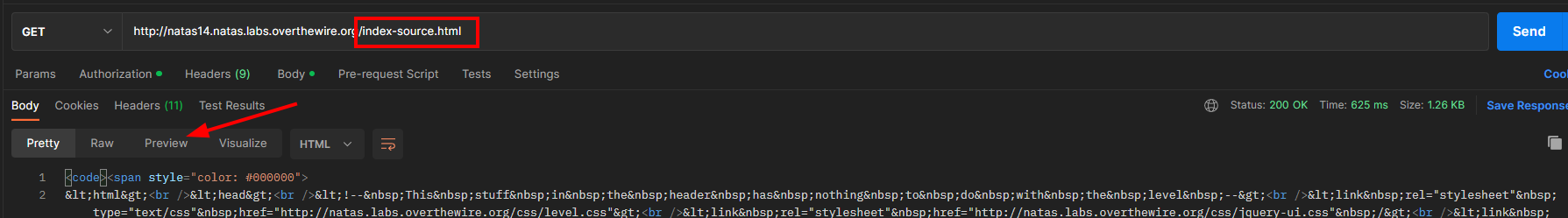 Agregamos la ruta del archivo a la URL y enviamos la petición, al recibir la respuesta vemos un montón de letras que se hacen difícil de leer, hacemos click en la pestaña Preview para ver todo de una manera más cómoda.
