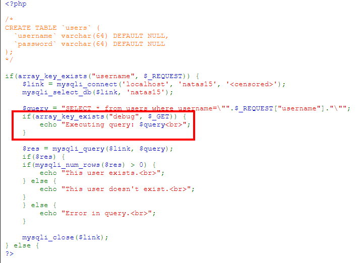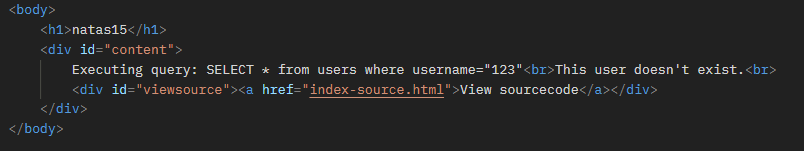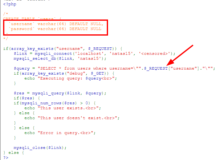 Lo primero que notamos es una query SQL comentada indicandonos que existe una columna username y password. También notamos un SQLI en la formación de una query, esta query es vulnerable porque no tiene ningún tipo de filtro y nosotros podemos ingresar lo que queramos.