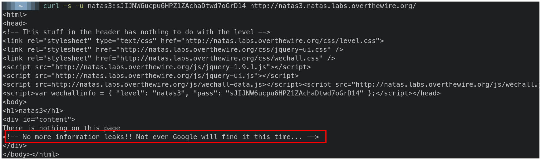 curl -s -u natas3:sJIJNW6ucpu6HPZ1ZAchaDtwd7oGrD14 http://natas3.natas.labs.overthewire.org/