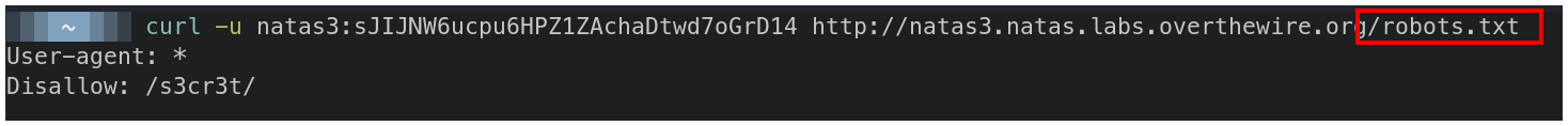 curl -u natas3:sJIJNW6ucpu6HPZ1ZAchaDtwd7oGrD14 http://natas3.natas.labs.overthewire.org/robots.txt
