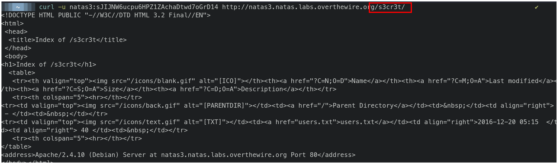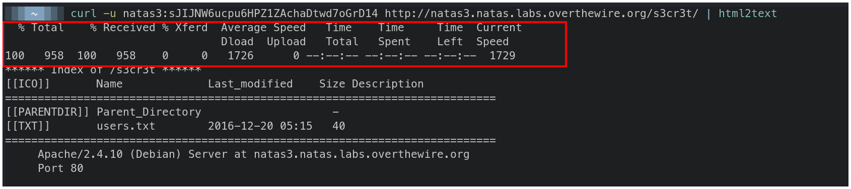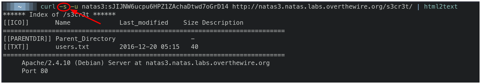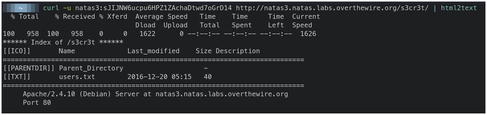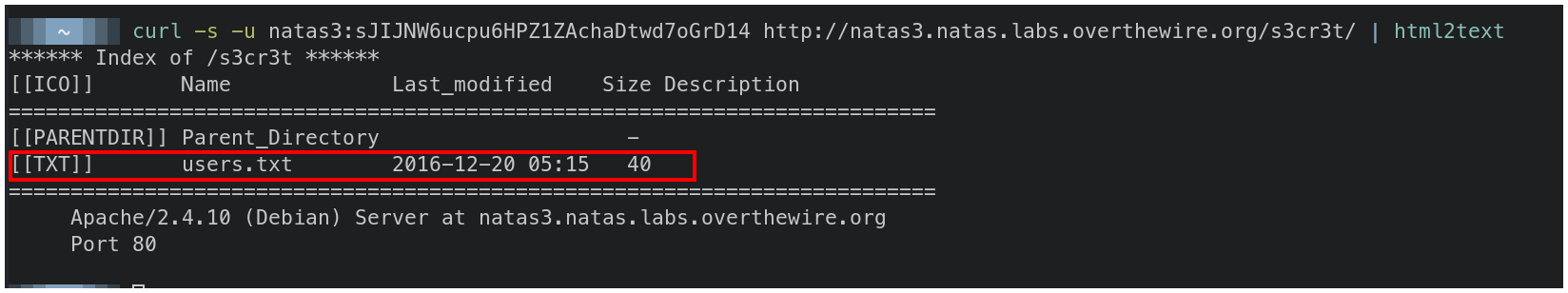 curl -u natas3:sJIJNW6ucpu6HPZ1ZAchaDtwd7oGrD14 http://natas3.natas.labs.overthewire.org/s3cr3t/ | html2text