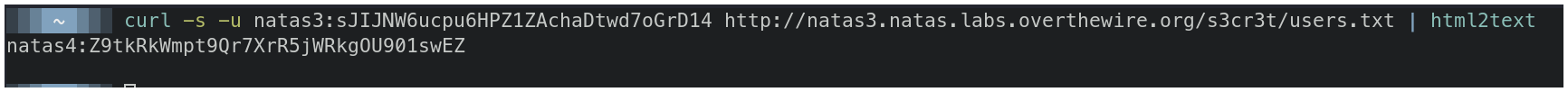 curl -s -u natas3:sJIJNW6ucpu6HPZ1ZAchaDtwd7oGrD14 http://natas3.natas.labs.overthewire.org/s3cr3t/users.txt | html2text