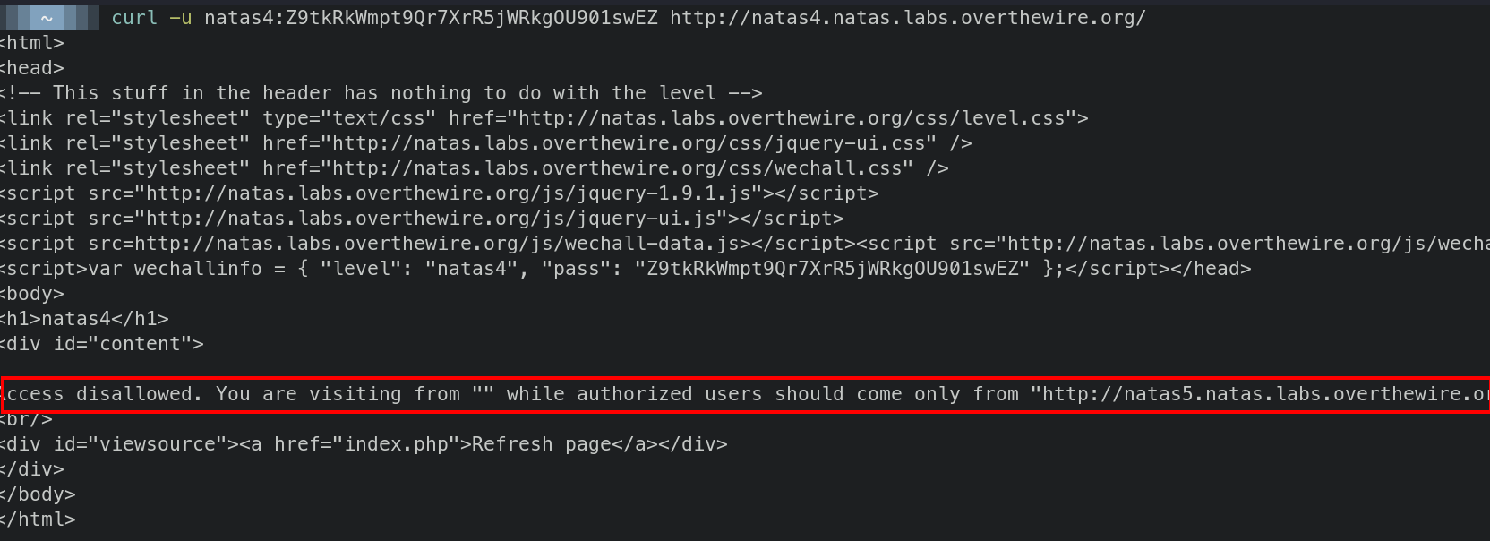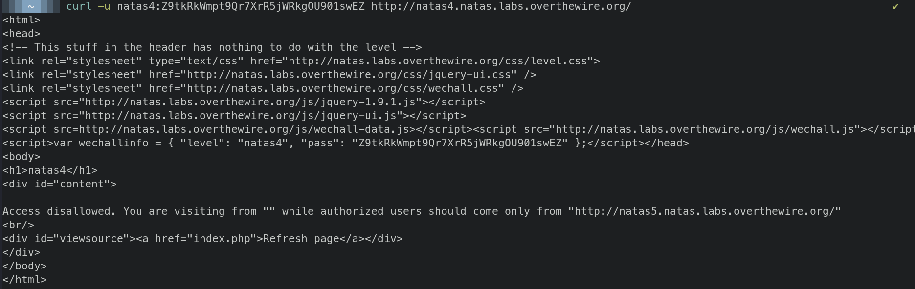curl -u natas4:Z9tkRkWmpt9Qr7XrR5jWRkgOU901swEZ http://natas4.natas.labs.overthewire.org/