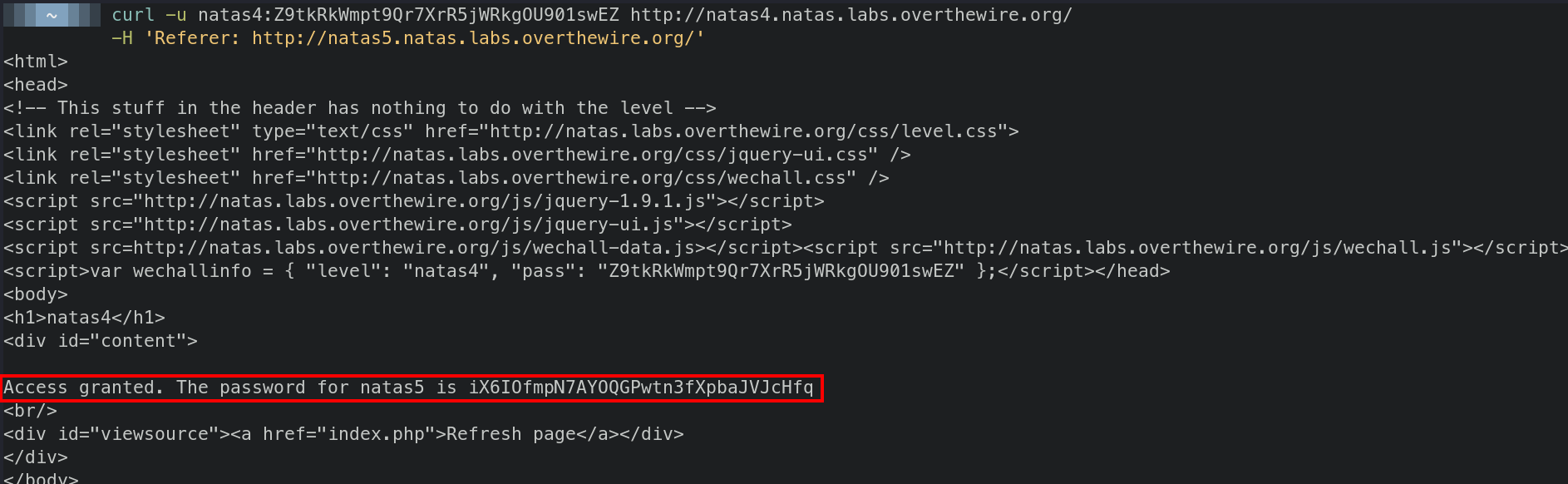 curl -u natas4:Z9tkRkWmpt9Qr7XrR5jWRkgOU901swEZ http://natas4.natas.labs.overthewire.org/ -H 'Referer: http://natas5.natas.labs.overthewire.org/'