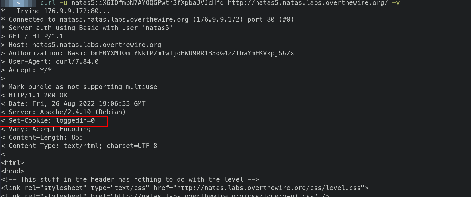 curl -s -u natas5:iX6IOfmpN7AYOQGPwtn3fXpbaJVJcHfq http://natas5.natas.labs.overthewire.org/ -v