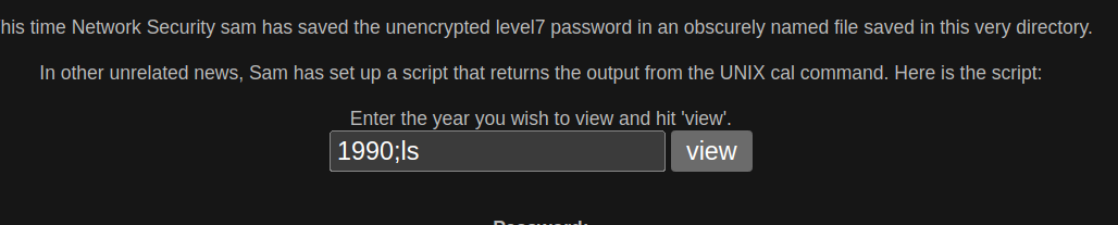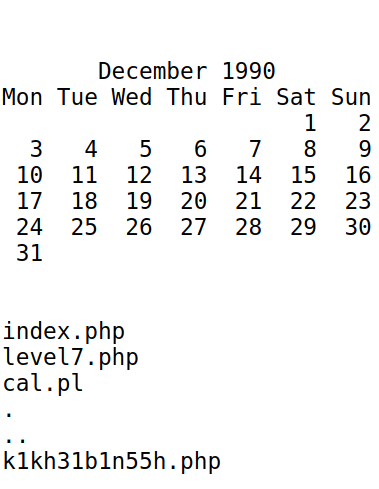 Realizamos unas pruebas para intentar ingresar comandos y escribimos 1990;ls. El ; es para terminar el comando cal y poder ejecutar un nuevo comando ls.