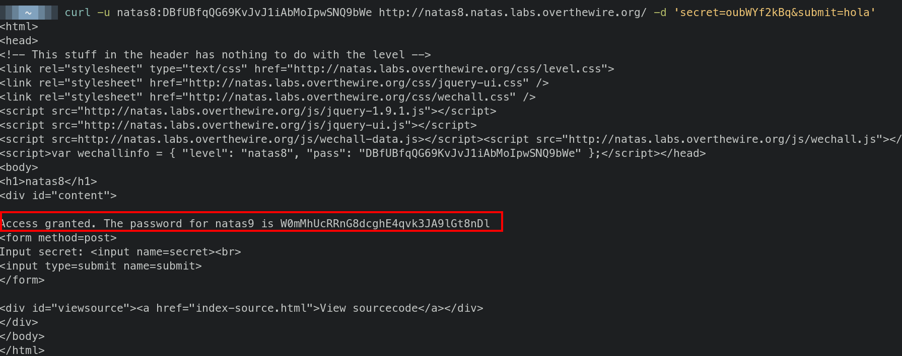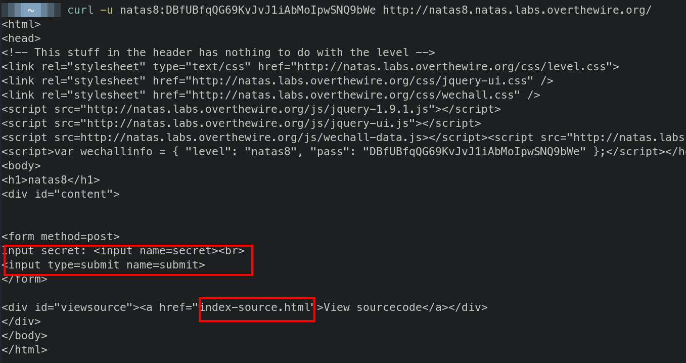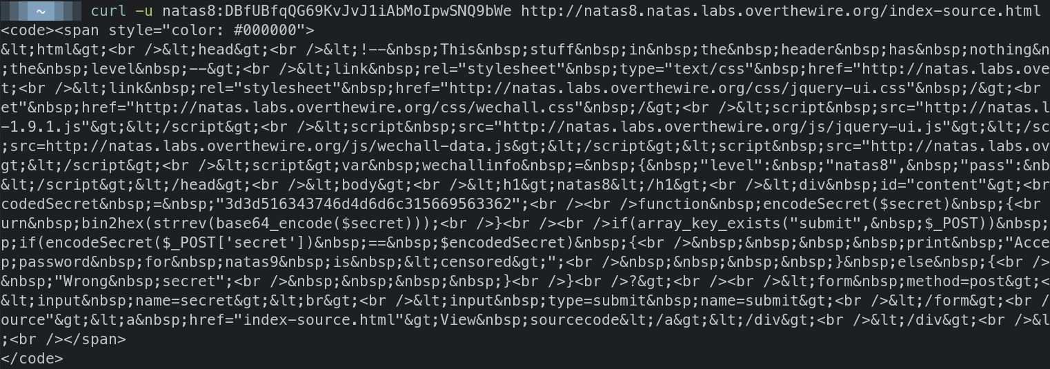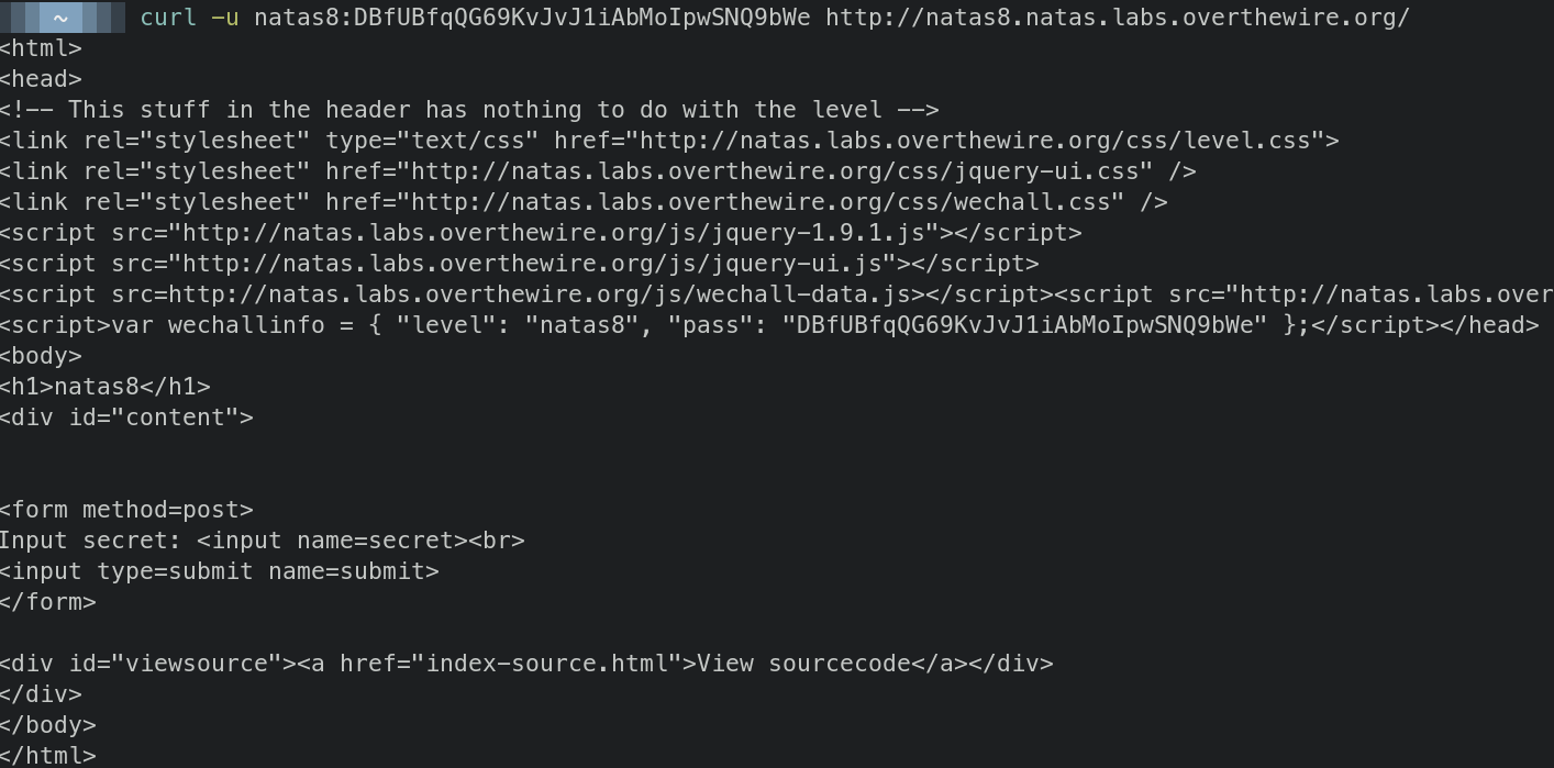 curl -u natas8:DBfUBfqQG69KvJvJ1iAbMoIpwSNQ9bWe http://natas8.natas.labs.overthewire.org/index-source.html
