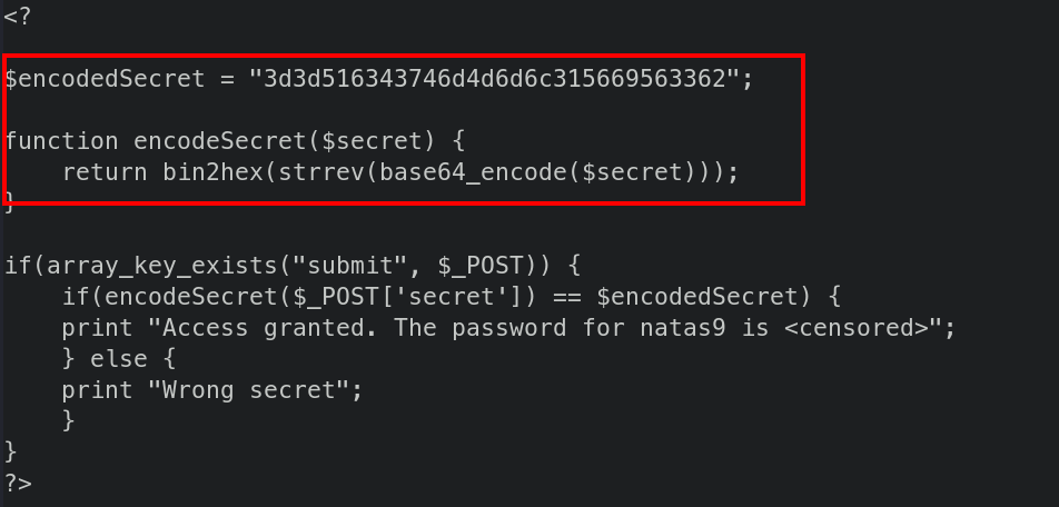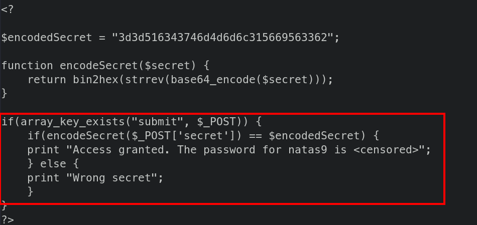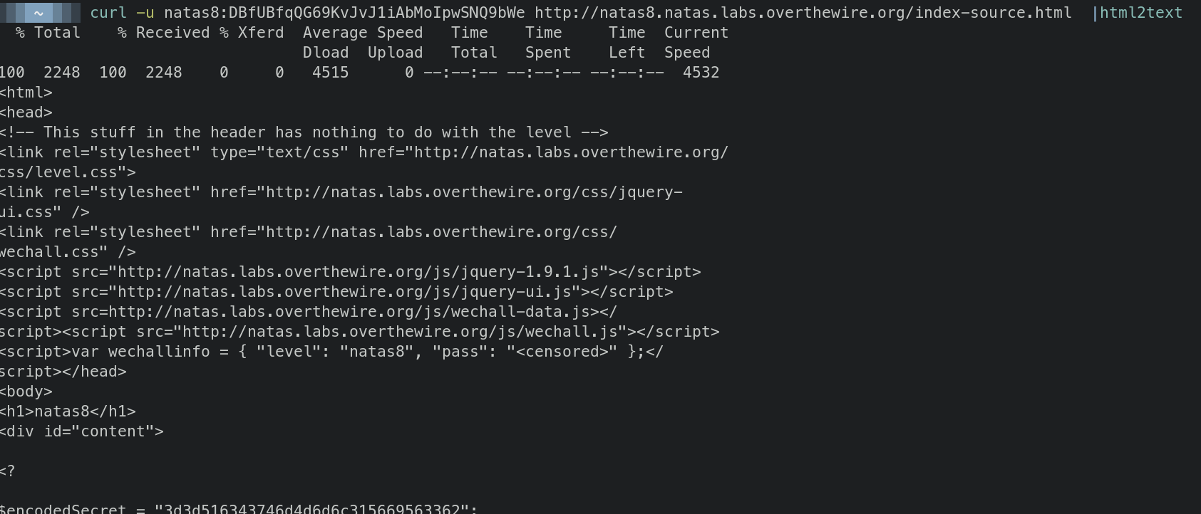 curl -u natas8:DBfUBfqQG69KvJvJ1iAbMoIpwSNQ9bWe http://natas8.natas.labs.overthewire.org/index-source.html | html2text