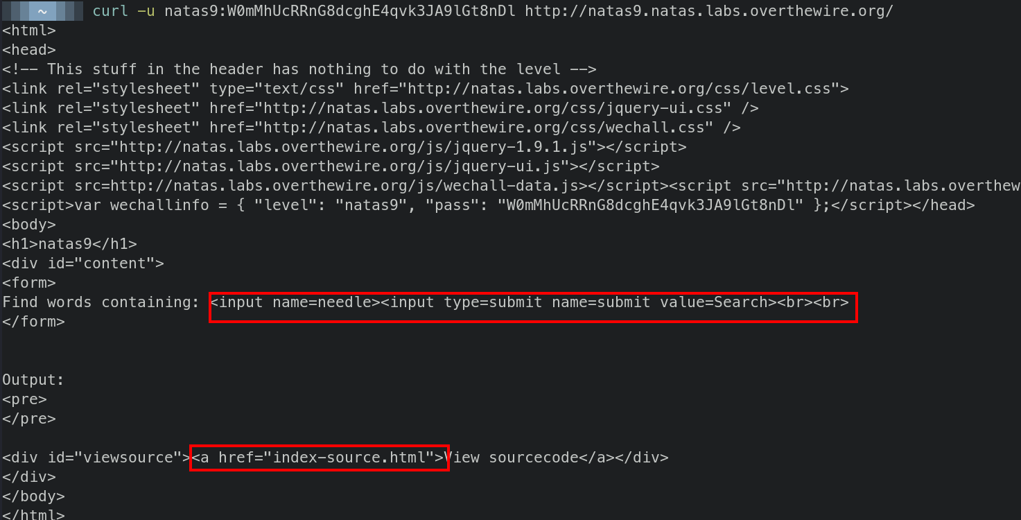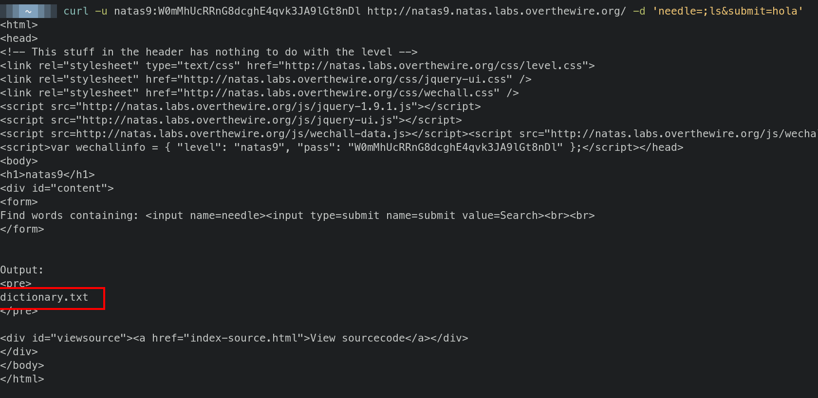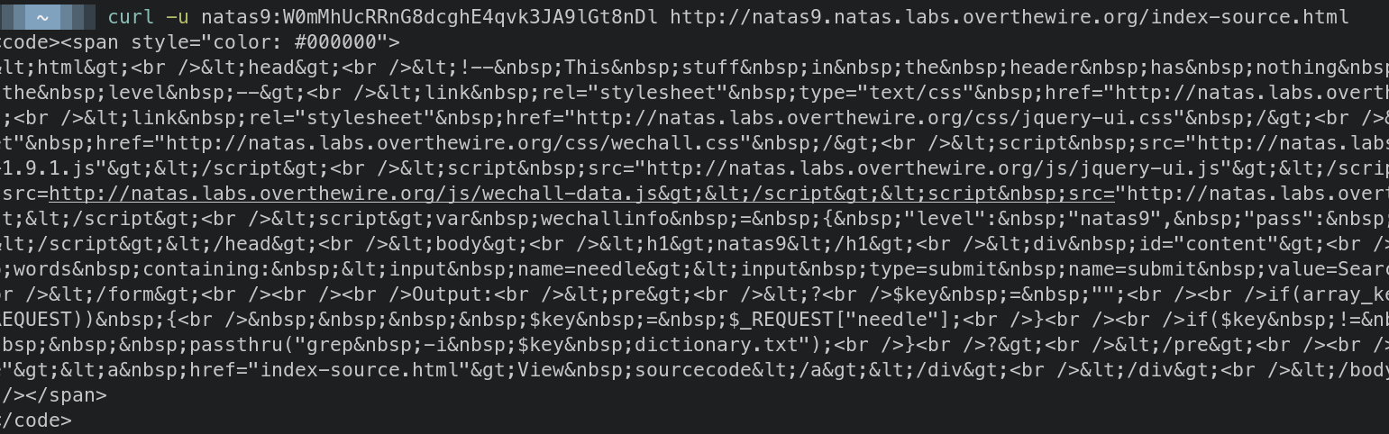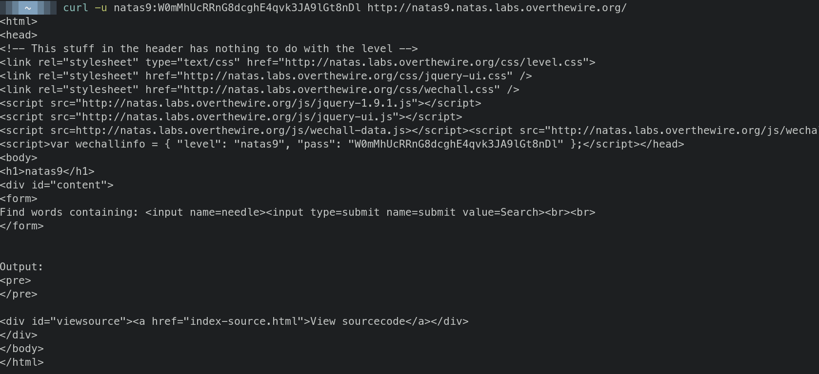 curl -u natas9:W0mMhUcRRnG8dcghE4qvk3JA9lGt8nDl http://natas9.natas.labs.overthewire.org/index-source.html