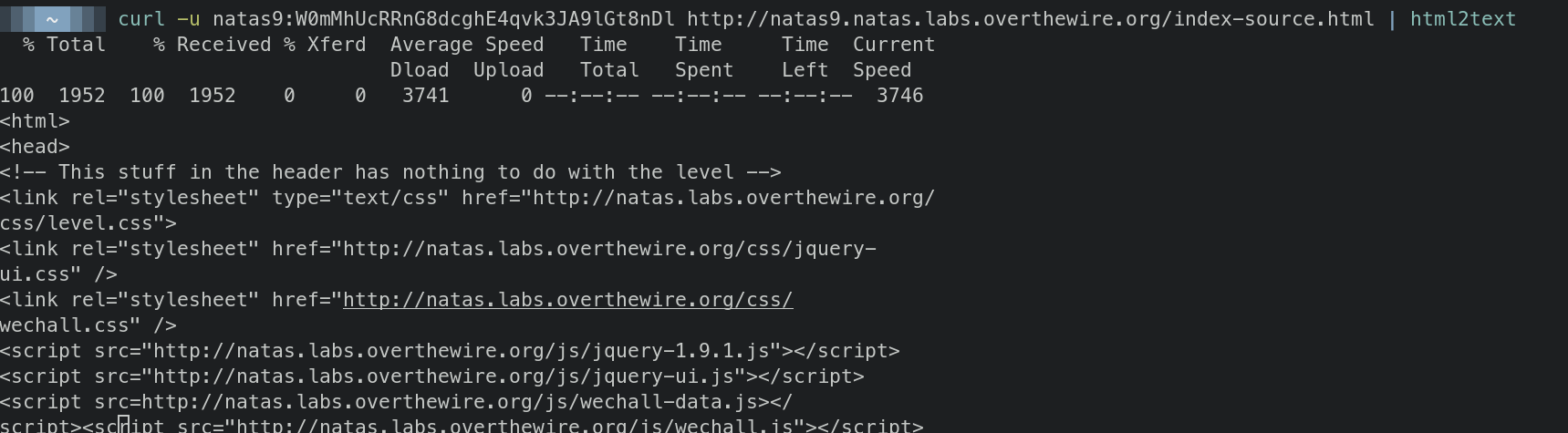 curl -u natas9:W0mMhUcRRnG8dcghE4qvk3JA9lGt8nDl http://natas9.natas.labs.overthewire.org/index-source.html | html2text