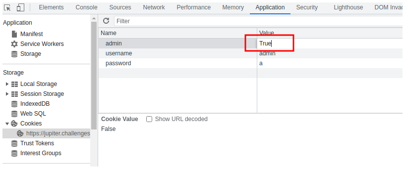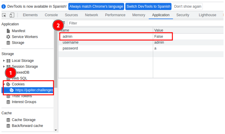 Hacemos click en la pestaña Cookies y podremos ver una cookie con nombre admin que tiene de valor False.