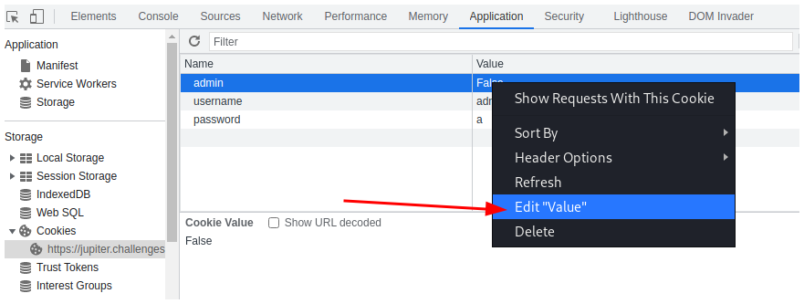 Debemos hacer click derecho sobre esta cookie y seleccionar Edit “value”.