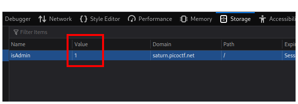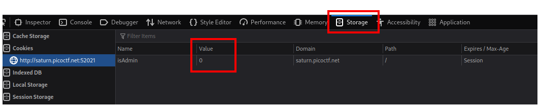 Después nos vamos a la pestaña Storage y podemos ver una cookie con nombre isAdmin y de valor 0.
