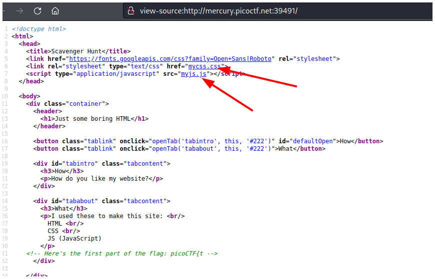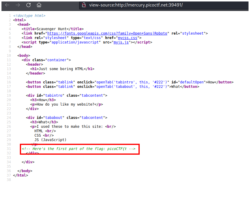 La descripción nos dice que hay información escondida en la aplicación, entonces hacemos click derecho y vemos el código fuente de la página principal. Ahí veremos la primera parte de la flag picoCTF{t.