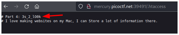 Si vamos al archivo .htaccess veremos la cuarta parte de la flag 3s_2_lO0k y otra pregunta. La respuesta es el archivo .DS_Store.
