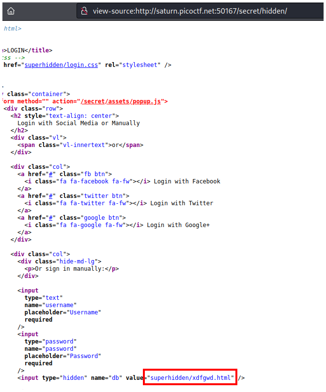 Pero si vamos a la ruta secrets/hidden veremos contenido y al final de la página veremos otro archivo llamado superhidden/xdfgwd.html.