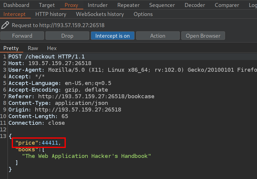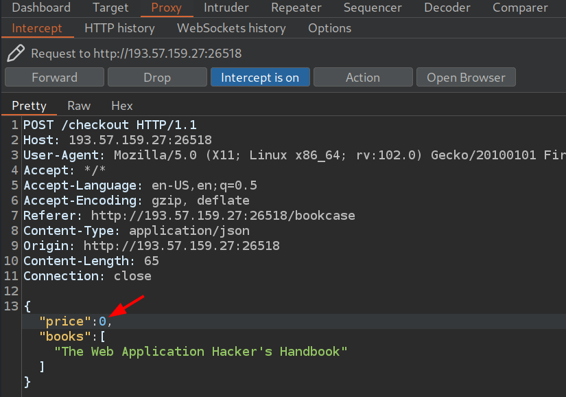 Podemos probar interceptar la petición que se realiza al hacer click en el botón Checkout con Burpsuite.